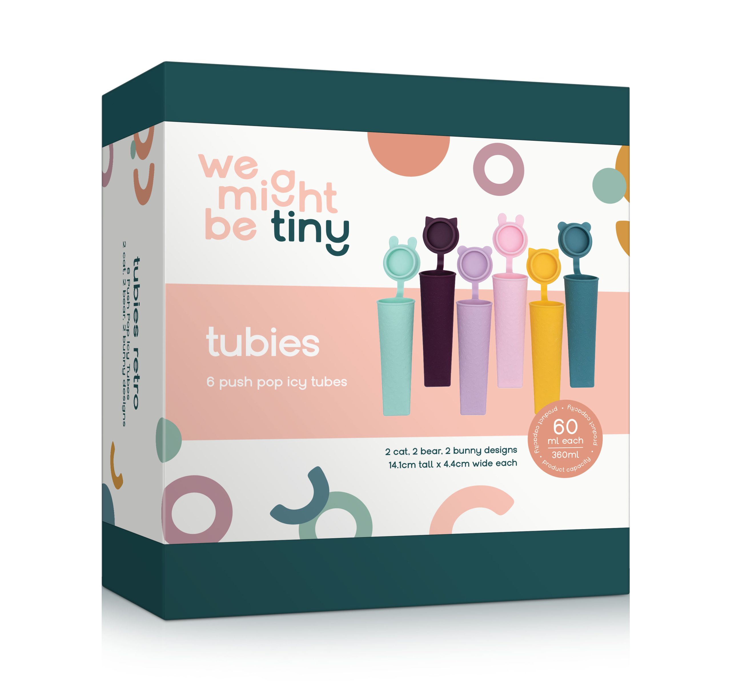 Popsicles are great for those warm summer days, but those melting moments can cause a dreaded mess and stickiness on tiny hands. Tubies are fun silicone push up moulds for all those icy treats, your mess-managing heroes and your new ice block besties! Each Tubies Set comes with 2 bear, 2 bunny and 2 cat Tubies with our signature We Might Be Tiny pattern for that much needed extra grip for small growing hands. Every colourful Tubie (60ml) also has an attached silicone lid to conveniently seal your icy pop while setting in the freezer or; if your tiny human gets distracted while snacking, simply reseal for later. For some extra cuteness, sneaky eyes can also be found on the inside of each mould that show up as a cheeky imprint on your littles’ ice block once they dive into their snacking session. Proudly designed in Australia.